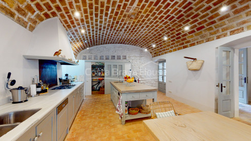 - Espaiosa cuina d'estil rústic-provençal, amb illa central de treball i àmplia zona menjador. A destacar l'espectacular sostre de mig arc de maçoneria de maó vist. La cuina accedeix a un pati interior decorat amb multitud de plantes, flors i font exterior. Al pati trobarem la zona barbacoa.