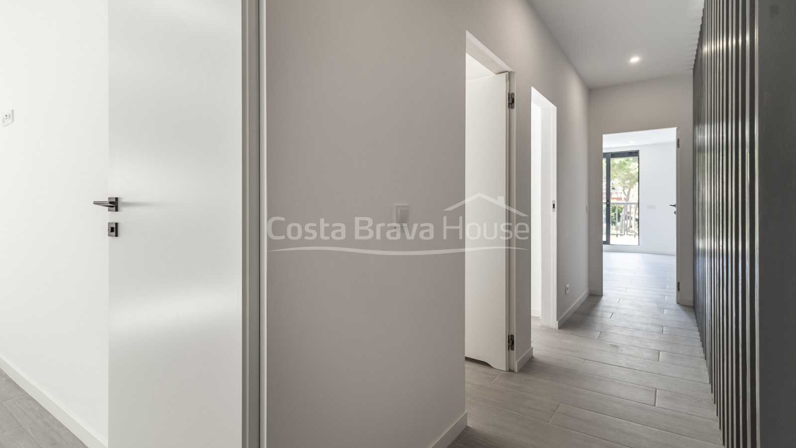 On the first floor, the night area consists of a master suite with a private bathroom and access to a private terrace. Additionally, there are two double bedrooms that share a full bathroom. All bedrooms include built-in wardrobes and large windows to maximize natural light. The wood-look porcelain flooring on this floor creates a warm and welcoming atmosphere.